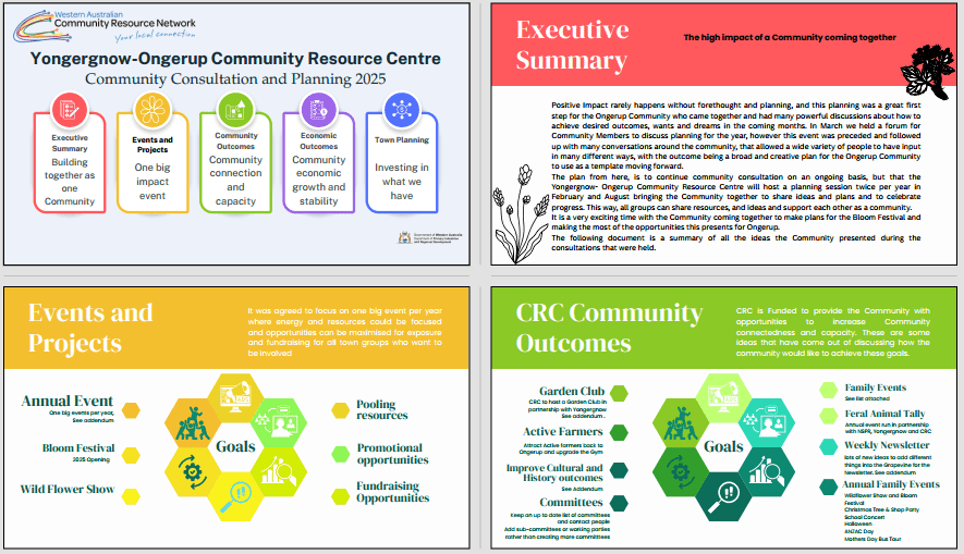 In March 2025 Yongergnow-Ongerup Community Resource Centre underwent a process of Community Consultation and held a Planning Session with the Community that resulted in the below Ongerup Planning Document. This is a key document to set future direction not only for the Yongergnow-Ongerup CRC, but also other Community Groups in Ongerup can refer to this in planning and seeking assistance with funding. An important part of the consultation process is that it is ongoing, and a further consultation session will be planned for August 2025.