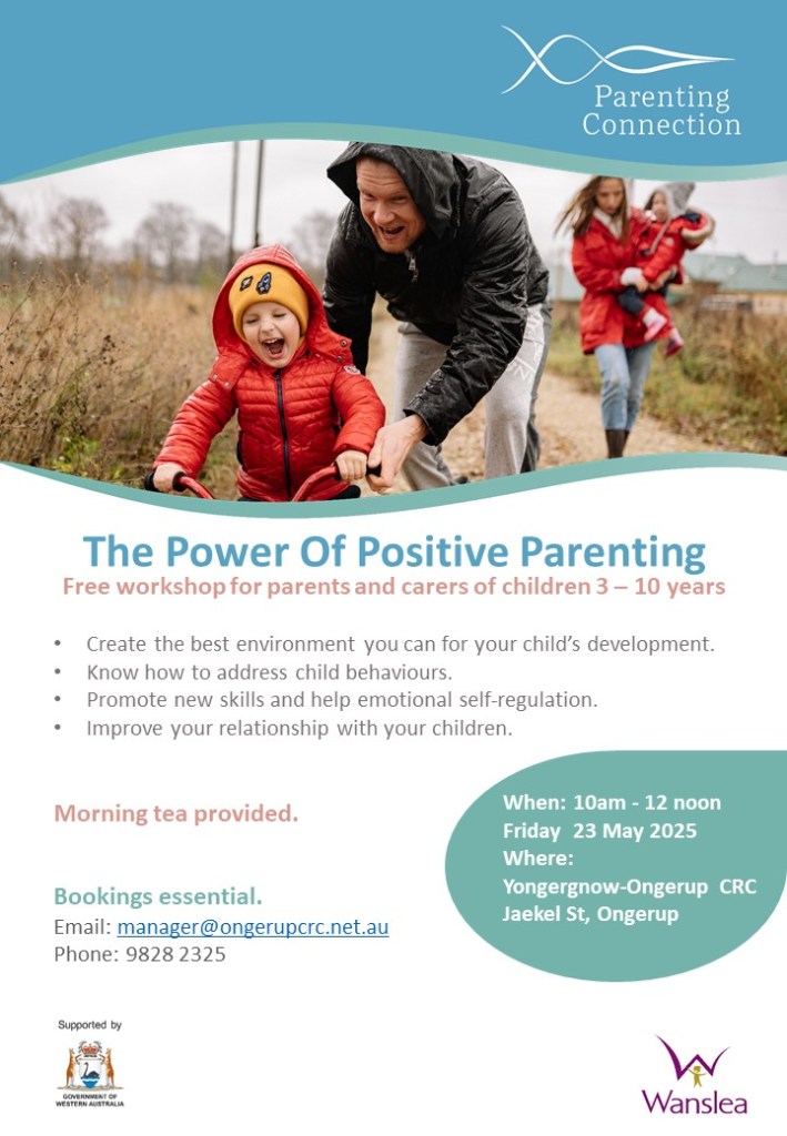Wanslea PPP Posted on May 7, 2025May 22, 2025 by ongerupcrc The Power of Positive Parenting presented by Wanslea for parents with children of all ages. Moring tea provided Share this: Click to share on X (Opens in new window) X Click to share on Facebook (Opens in new window) Facebook Like Loading... Related